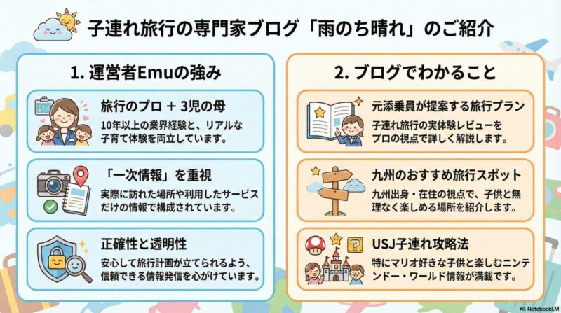 このブログは、子連れ旅行が初めてのママでも、安心して一歩を踏み出せるように、実体験に基づいた“失敗しない旅のコツ”をお届けするサイトです。